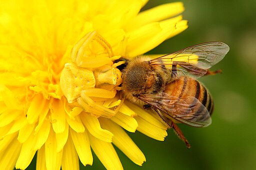 However what you see is an illusion. The bee is in its last stages of life! It is a feast for a crab spider i.e sitting camouflaged, mimicking the flower. Being camouflaged, the crab spider is also hidden from its prey.