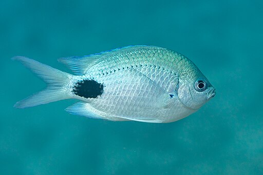 Known as False-eye sergeant, this fish has a black spot in its rear end. It mimics the eyes of larger predators to intimidate attackers or to deflect attacks away from its vital body parts. You can see such kind of deflection in butterflies as well. They too have false eyespots on their wings.