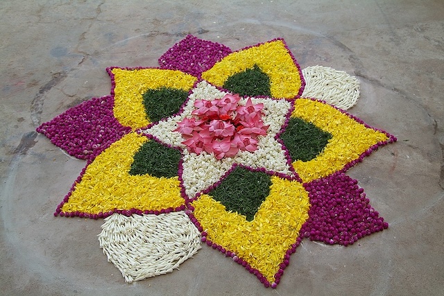 Traditionally in southindian homes, rangoli is made from rice powder. But these days during festivals poo Kolam which means rangoli with flowers is also common. Using petals of rose, marigold, jasmine, and even colourful leaves, people create vibrant patterns that celebrate both art and nature. During festivities like Onam they are more common.