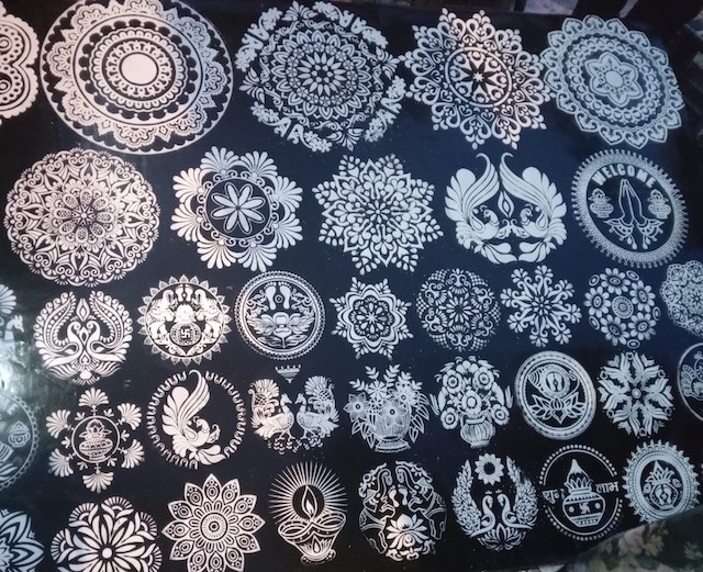 Ready made stencil is a modern way of doing rangoli. They are circular and come with silkscreens with designs. Rangoli powder can be sieved through this to get the pattern. Quick and easy it saves time for a hassle free rangoli. Rangoli kits too are available online these days to add that colour and festivity to your homes.