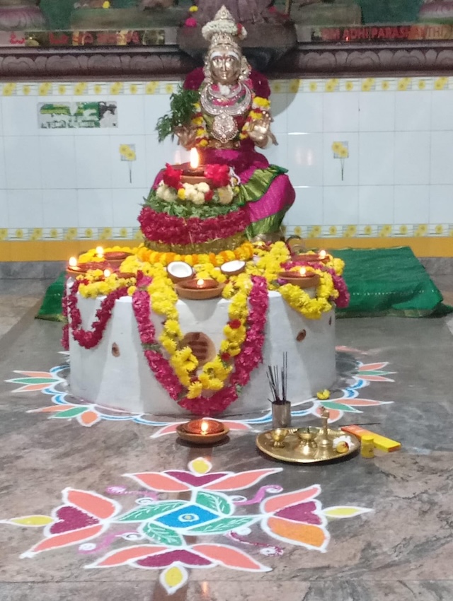 Rangoli was not just outside homes or as a way to welcome guests. It was also done in front of temples and gods. This rangoli was done in front of Devi or goddess. Notice how floral and creeper patterns also surround the pedestal of the diety.