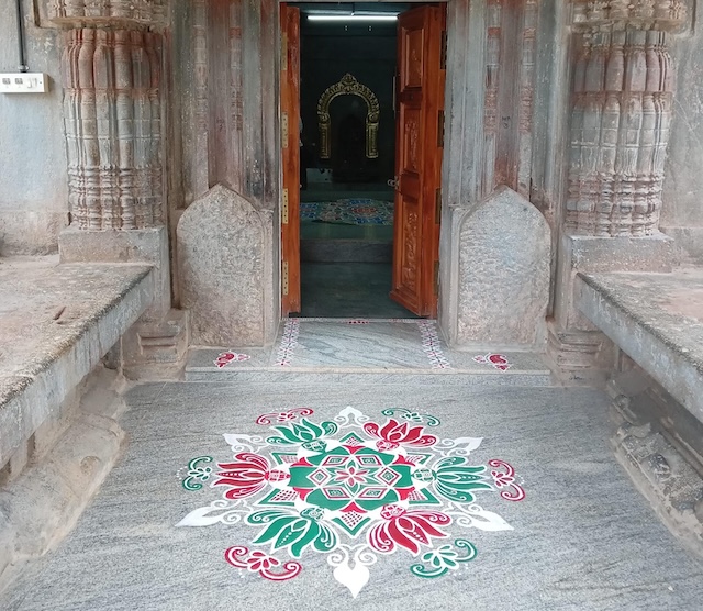Not just rice power or chalk powder, a paste of rice powder was also used for making rangoli. Sometimes rangoli used paint colours too. This colourful rangoli is done in front of a temple and is rather permanent.
