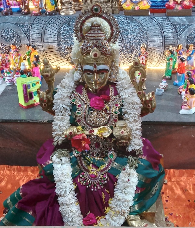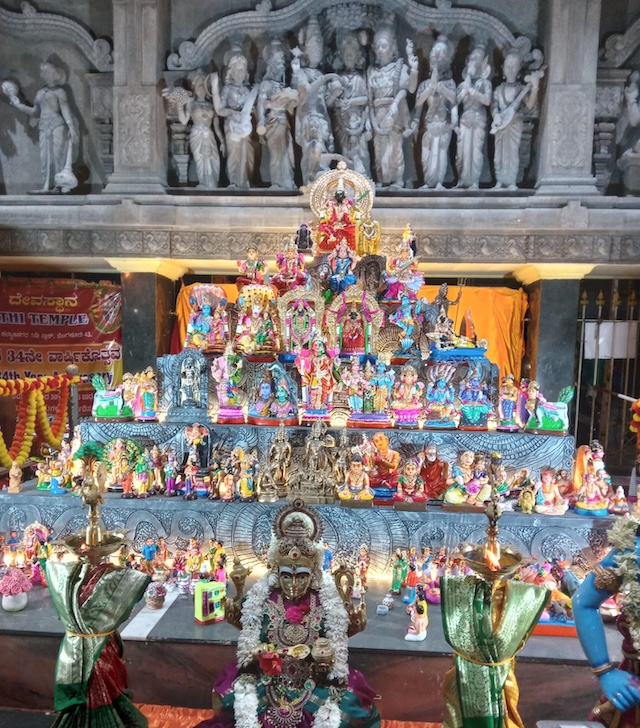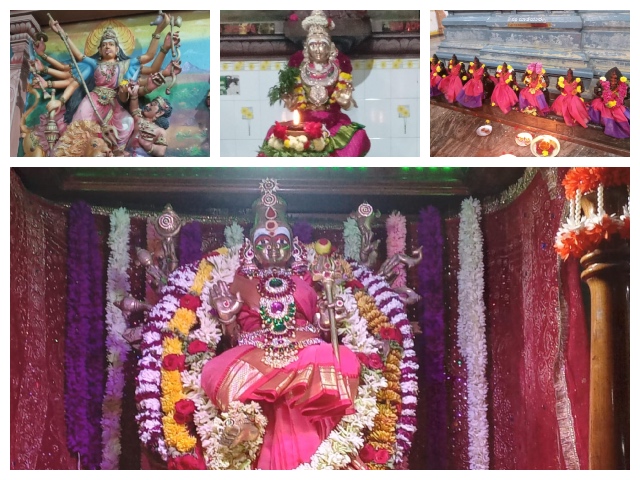 During Navaratri, the temples in the city are buzzing with energy. So many people, chants, prayers, flowers and lamps. The glow and energy is tremendous. Devi is worshipped in many forms right from her popular figure of Mahishasuramardini, Adi Shakti to village dieties and the saptamatrikas or the seven mothers. The picture above shows this. While the extreme left is the image of Mahishasuramardini where Durga with ten arms, riding a lion, weapons in hand, kills the buffalo demon named Mahishasura, the next is the very image of creation where Devi gets worshipped as Primordial Power-the Adi Shakthi, then there are saptamatrikas- the extensions of Durga and according to Devi Mahatmya text, the Mātṛkās are said to arise from Durga’s own energy and finally a utsav Murthy or the chariot image of Devi with her hand in the Abhaya pose or in blessings.
